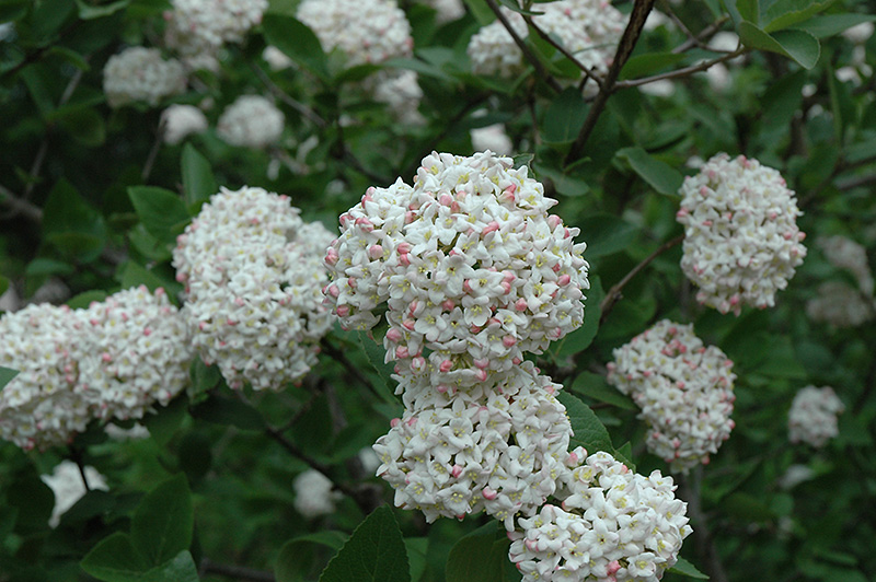 Fragrant Viburnum (tree form) features showy balls of fragrant white flowers at the ends of the branches in early spring, which emerge from distinctive pink flower buds before the leaves. It has dark green deciduous foliage. The round leaves turn an outstanding deep purple in the fall. The black fruits are held in clusters from late summer to late winter.