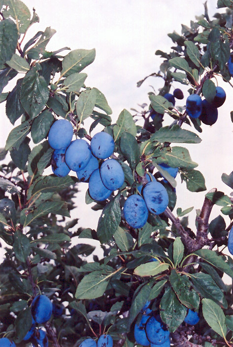 A commercially common fruit tree with showy fragrant white flowers in spring and tasty purple-blue prune-plums in late summer; an upright spreading tree, quite compact and ornamental; needs full sun, well-drained soil and a pollinator