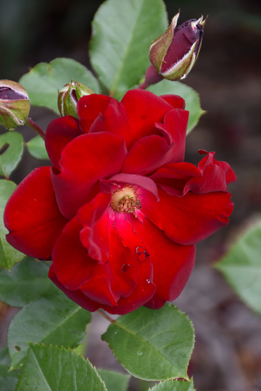 Navy Lady Rose is blanketed in stunning fragrant semi-double dark red flowers at the ends of the branches from late spring to mid fall. The flowers are excellent for cutting. It has forest green deciduous foliage. The glossy oval compound leaves turn an outstanding yellow in the fall.