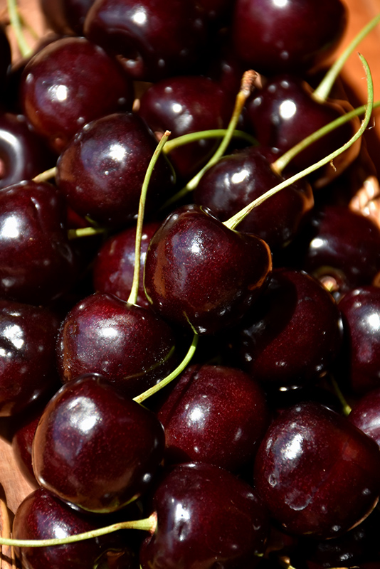 Lapins Cherry is a large shrub that is commonly grown for its edible qualities. It produces red round fruit (technically 'drupes') with dark red flesh which are usually ready for picking in early summer. The fruit will often fade to black over time. Note that the fruits have hard inedible pits inside which must be removed before eating or processing. The fruits have a sweet taste and a juicy texture.