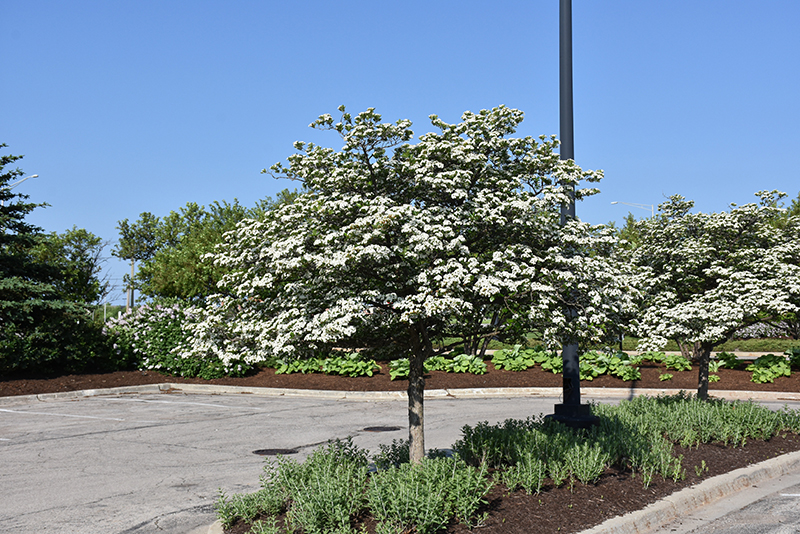 Thornless Cockspur Hawthorn is a deciduous tree with a stunning habit of growth which features almost oriental horizontally-tiered branches. Its relatively fine texture sets it apart from other landscape plants with less refined foliage.