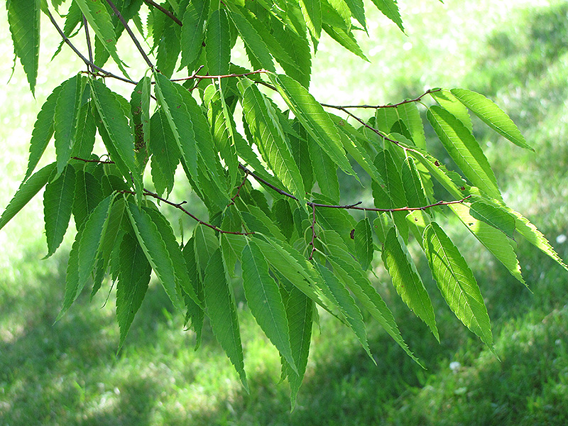 Japanese Zelkova has forest green deciduous foliage on a tree with an upright spreading habit of growth. The serrated pointy leaves turn an outstanding orange in the fall.