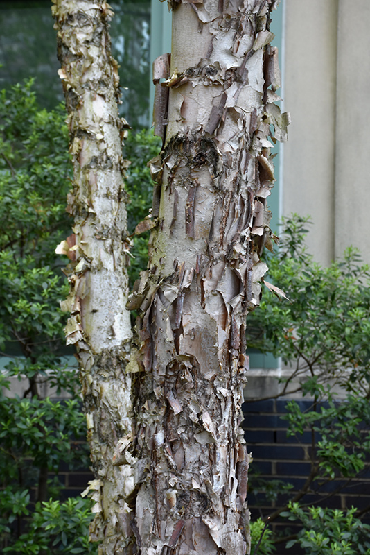 This selection is valued for its stunning bark, with white, brown and tan colors all peeling from mature trunks, denser crown and more heat tolerant than the species; good fall color; requires acidic soil, susceptible to chlorosis in alkaline soils