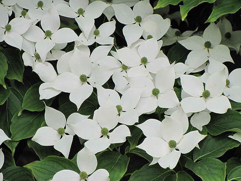 A lovely shrubby and broad spreading dogwood with large white bracts; late spring blooms last for several weeks; covered in raspberry-like fruit in fall