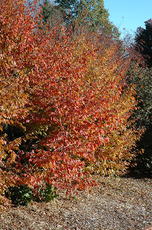 The American Hornbeam has forest green deciduous foliage on a tree with a round habit of growth. The pointy leaves turn an outstanding orange in the fall. It produces small clusters of tan hop-like fruit from early fall to late winter. The smooth silvery blue bark adds an interesting dimension to the landscape.