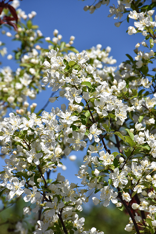 Red Jewel Flowering Crab is blanketed in stunning clusters of fragrant white flowers along the branches in mid spring, which emerge from distinctive shell pink flower buds before the leaves. The fruits are showy cherry red pomes carried in abundance from early fall to late winter. It has dark green deciduous foliage. The pointy leaves turn yellow in fall.